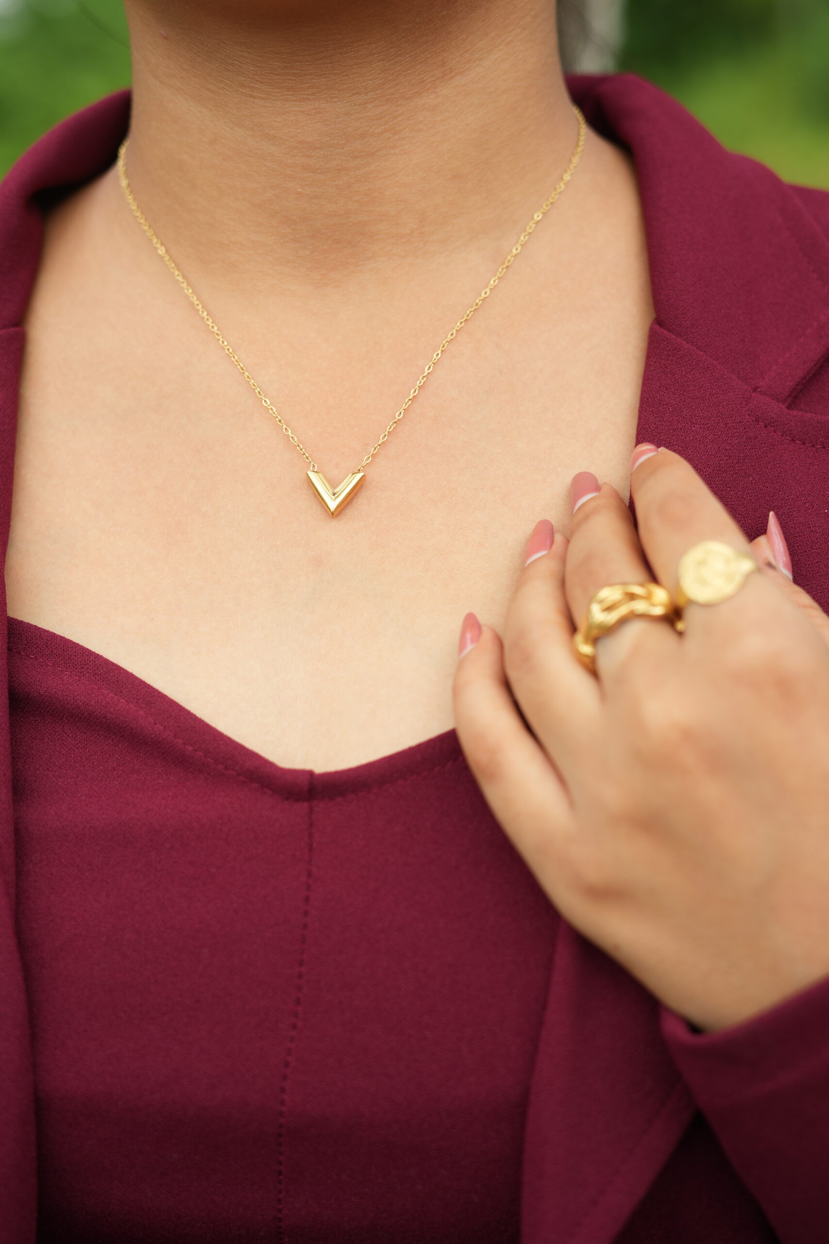 Sleek, modern, and effortlessly chic — the Gold V Luxe Necklace features a minimalist V-shaped pendant that symbolizes victory, vision, and versatility. Crafted in radiant gold with a fine, delicate chain, it is perfect for layering or wearing as a standalone statement. Designed with an anti-tarnish and non-fading finish, this piece retains its luminous shine, making it a timeless addition to your jewellery collection for both everyday elegance and special moments.